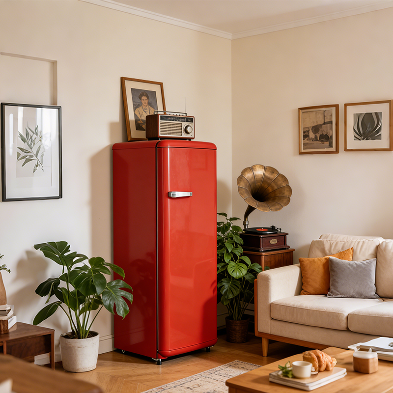 核心设计 单门大容量设计,满足日常饮品、蔬果及多类食材冷藏需求,复古外观兼具实用性与装饰性