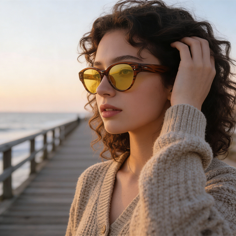 这款琥珀框黄片椭圆墨镜以复古琥珀色板材框搭配通透黄色镜片,自带慵懒氛围感,能轻松打造文艺复古的松弛感造型。柔和的椭圆线条可修饰脸部棱角,适配海边漫步、城市漫游、日常通勤等多种场景,风格适配复古、文艺、松弛感等不同穿搭。镜片具备专业防紫外线功能,有效阻隔紫外线伤害,兼顾时尚造型与眼部防护,镜架选材轻盈,佩戴舒适不压鼻,是兼具颜值与实用性的氛围感时尚配饰。