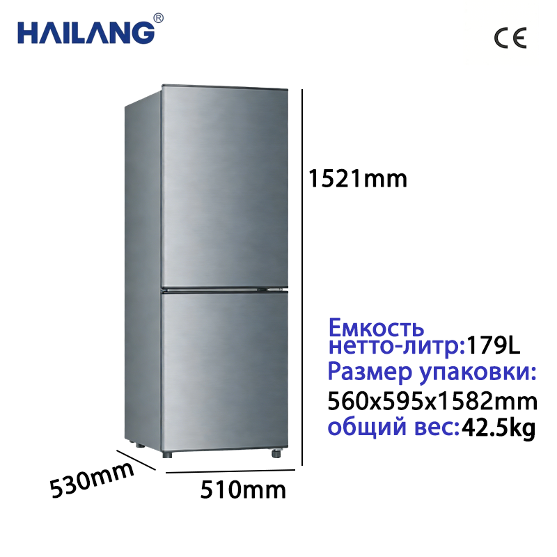 双门冰箱179 升,整机尺寸为 510mm×530mm×1521mm,毛重 42.5kg,体积适中不占过多空间,适合租房、小户型或两口之家使用。底部配有可滚动轮子,移动灵活,摆放位置可随心调整。