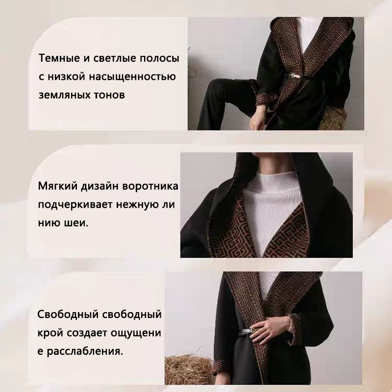 Тщательно продуманный крой и роскошные детали подчеркивают женский шарм и изящество, а широкий воротник с лацканами служит ярким акцентом. Это пальто легко сочетается с платьями, юбками или брюками, создавая универсальные образы для повседневной носки и торжественных случаев.