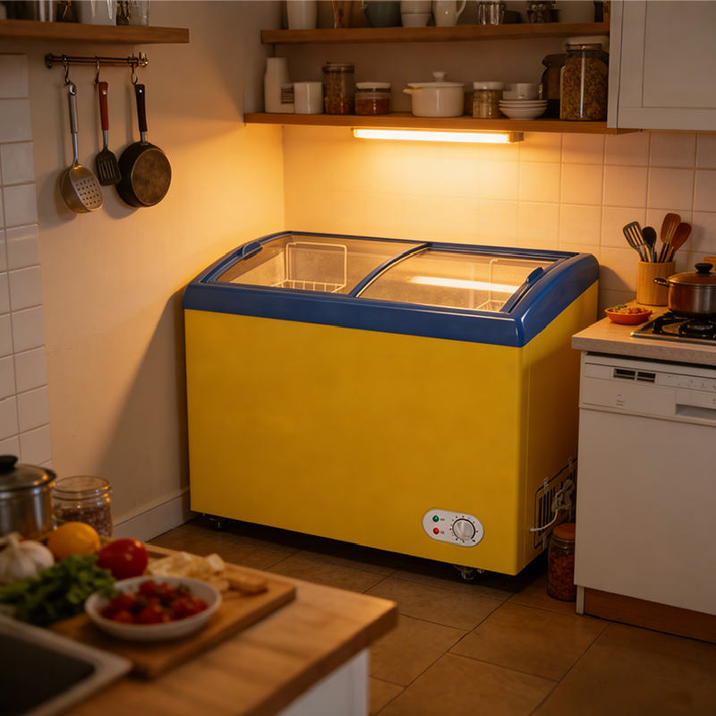 卧式机身设计,横向空间利用率高,大容积不占过多空间。双弧形透明玻璃门搭配黄蓝配色,醒目吸睛,兼具展示性与美观性,适配各类商铺风格。门体密封胶条加厚设计,冷气流失少,减少能耗。底部带滚轮,移动灵活,便于清洁和位置调整。加厚发泡层箱体,保温性能优异,减少压缩机频繁启动,进一步提升节能表现。
