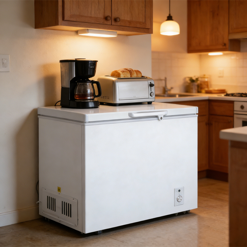 350L 超大容量,卧式结构仅占 0.80㎡空间,适配小户型厨房、租房、小型商铺等场景,既能满足日常食材、冻肉海鲜的保鲜需求,也能储存冰淇淋、冷饮等冷冻食品。顶开式门体搭配密封胶条,冷气流失少,提升保鲜效果同时降低能耗。机械旋钮多档控温,可实现 - 18℃~10℃宽幅调节,冷藏 / 冷冻一键切换,老人新手都能轻松操作。
