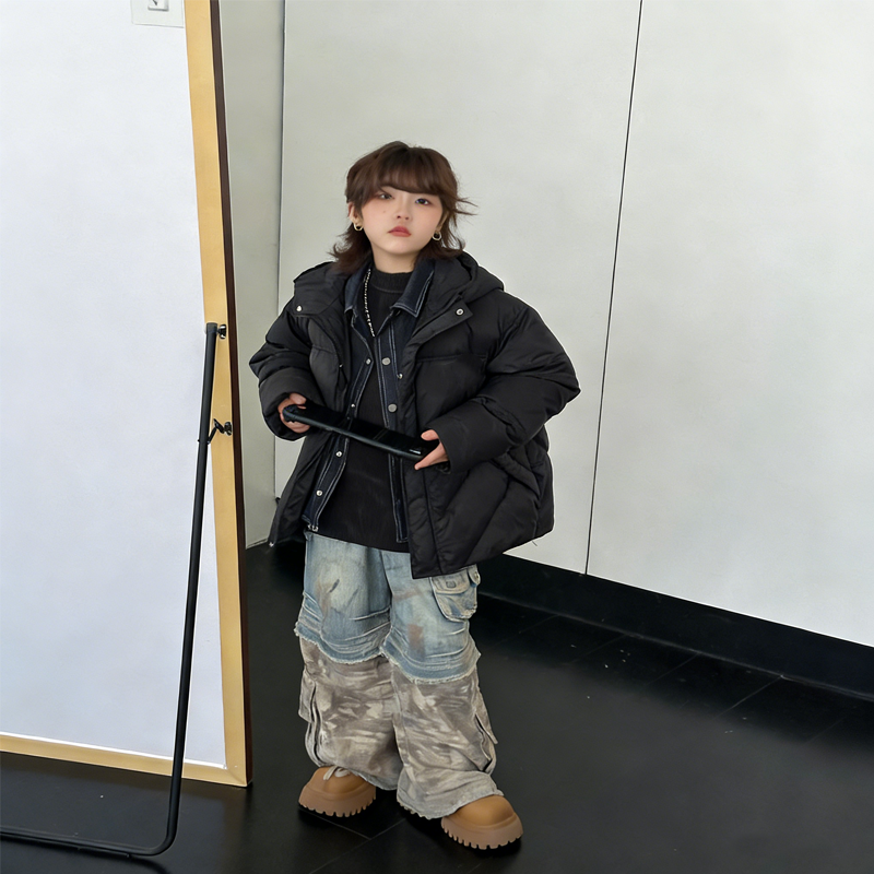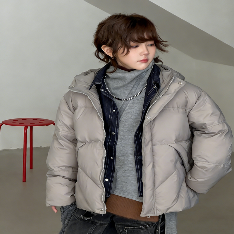 这款儿童假两件羽绒服以浅灰色为主调,拼接牛仔纹内领设计,打造层次感潮流造型,男女童同款适配多种穿搭。宽松落肩剪裁不束缚孩子活动,连帽设计紧密贴合头部,有效防风锁温。高蓬松度羽绒填充,锁温保暖效果优异,轻松应对冬日低温。表面采用防泼水面料,日常出行无惧雨雪污渍,一擦即净更省心。内里亲肤柔软,呵护孩子娇嫩肌肤,无论是上学还是户外游玩,都是孩子冬日保暖的个性之选。