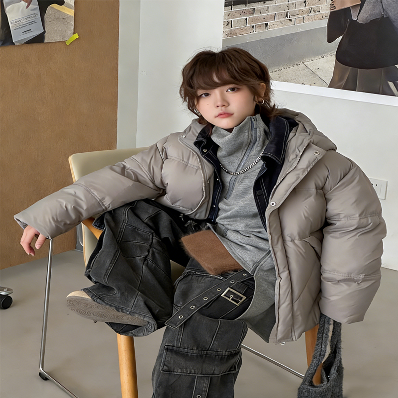 儿童假两件连帽羽绒服 浅灰宽松加厚保暖男女童冬装外套
