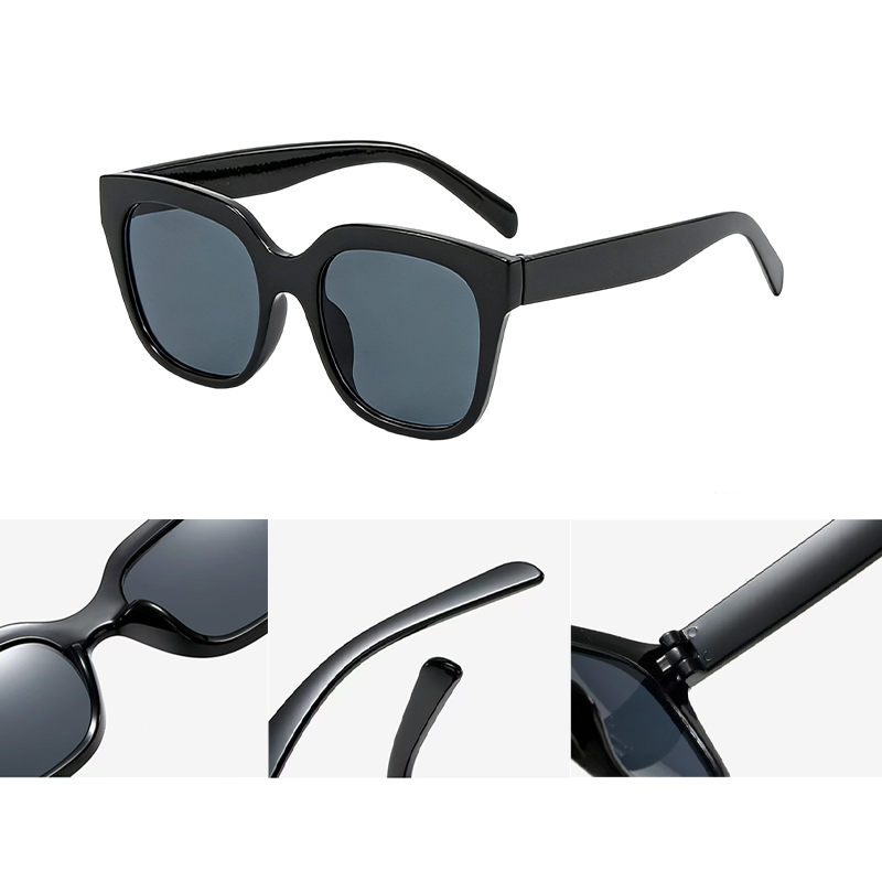 这款太阳镜采用经典大框方形设计,纯黑镜身简约百搭,大框造型可修饰脸型,轻松打造显脸小的视觉效果,适配日常通勤、出游、街拍等多种场景。镜片具备 UV400 防护功能,可有效阻隔紫外线,强光下也能保持清晰视野,兼顾美观与实用。镜架材质轻盈柔韧,镜腿贴合耳型,长时间佩戴不易压鼻夹耳,细节做工精致,是日常防晒与造型搭配的必备配饰。
